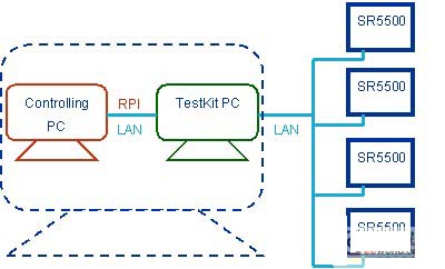 SR5500M提供了RPI接口(Remote Programming Interface)供外部程序控制SR5500M。如圖3所示,SR5500 Testkit軟件所在電腦通過(guò)TCP/IP與1臺(tái)至4臺(tái)SR5500M連接,控制電腦亦通過(guò)TCP/IP與SR5500M連接(通常, 可以用一個(gè)Switch連接所有設(shè)備);控制電腦和SR5500 Testkit軟件所在電腦合并為一臺(tái)電腦。