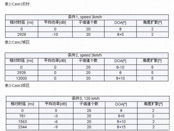 1)多天線解調(diào)測(cè)試(靜態(tài)測(cè)試):在不同的來(lái)波角度(DOA)下測(cè)試接收性能。各條徑存在一定的角度擴(kuò)展,各條徑分別來(lái)自不同的角度。驗(yàn)證在該傳播環(huán)境下接收機(jī)的解調(diào)性能。傳播環(huán)境如表1-表3所示。
