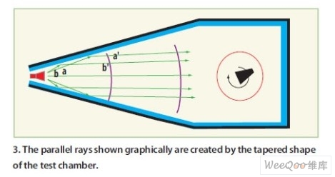 錐形暗室沒有消除鏡面反射。錐體形狀使鏡面區域更接近饋源(源天線的孔徑),因此鏡面反射成為照射的一部分。鏡面區域可以用來通過形成一組并行射線入射進靜區,從而產生照射。如圖3所示,最終的靜區幅度和相位錐度接近自由空間中的期望值。
