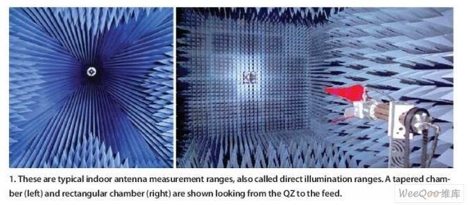 在傳統的遠場天線測試場中,發射和接收天線分別位于對方的遠場處,兩者通常隔得足夠遠以模擬想要的工作環境。AUT被距離足夠遠的源天線所照射,以便在AUT的電氣孔徑上產生接近平面的波陣面。遠場測量可以在室內或室外測試場進行。室內測量通常是在微波暗室中進行。這種暗室有矩形的,也有錐形的,專門設計用來減少來自墻體、地板和天花板的反射(圖1)。在矩形微波暗室中,采用一種墻面吸波材料來減少反射。在錐形微波暗室中,錐體形狀被用來產生照射。