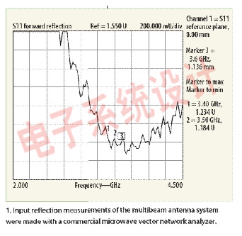 許多貼片天線都是在單一電介質基板上以線性方式對貼片元素進行排列以分別獲得15 deg.的方位束寬和7deg.的垂直束寬。四束天線設計需要最少四個貼片天線部件。采用本建議技術的四束系統被設計成具有26 dB天線增益、前-后比率高于30dB、副瓣水平20dB(小于主瓣水平)等指標。采用商用微波VNA對一個四束天線設計的性能進行了測量,采用的全掃頻范圍是2.0 到4.5 GHz、結果顯示在圖1中。天線系統的工作范圍在3.2 到4.2 GHz、VSWR小于1.50:1。