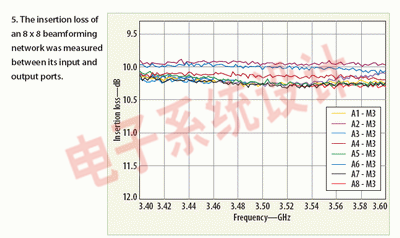 為展示該設計方法,設計了一個用于3.4到3.6GHz頻段的四束天線波束成型器。用安捷倫科技的(www.agilent.com)N5230A矢量網絡分析儀對其性能進行了測量,N5230A在工作時與同樣來自安捷倫的也工作在3.4到3.6GHz范圍的U3042A多口測試裝置連接。圖3、圖4和圖5顯示的是基于該設計方法的典型八波束波束成型網絡的結果。